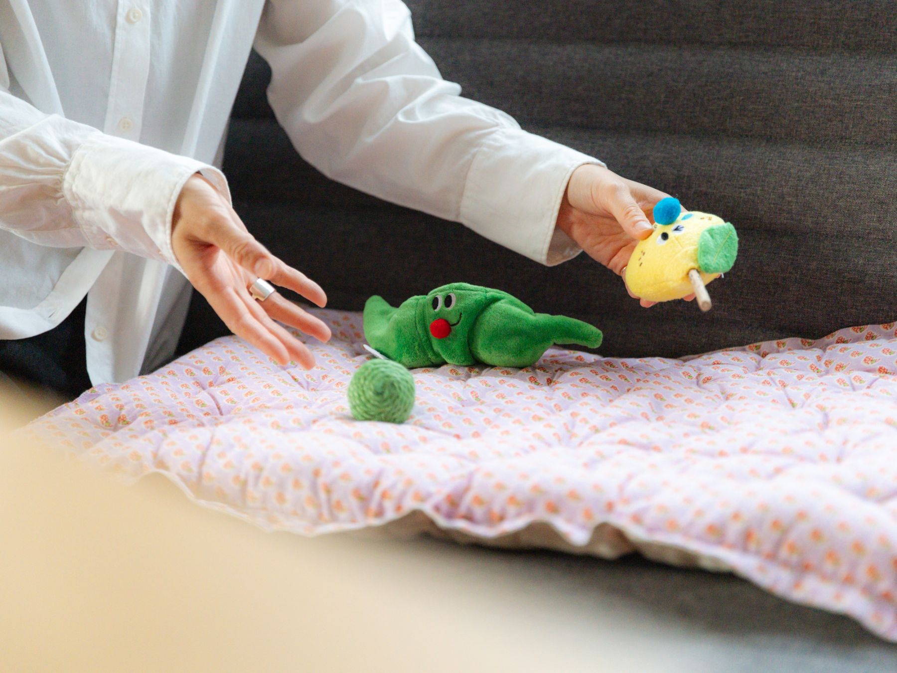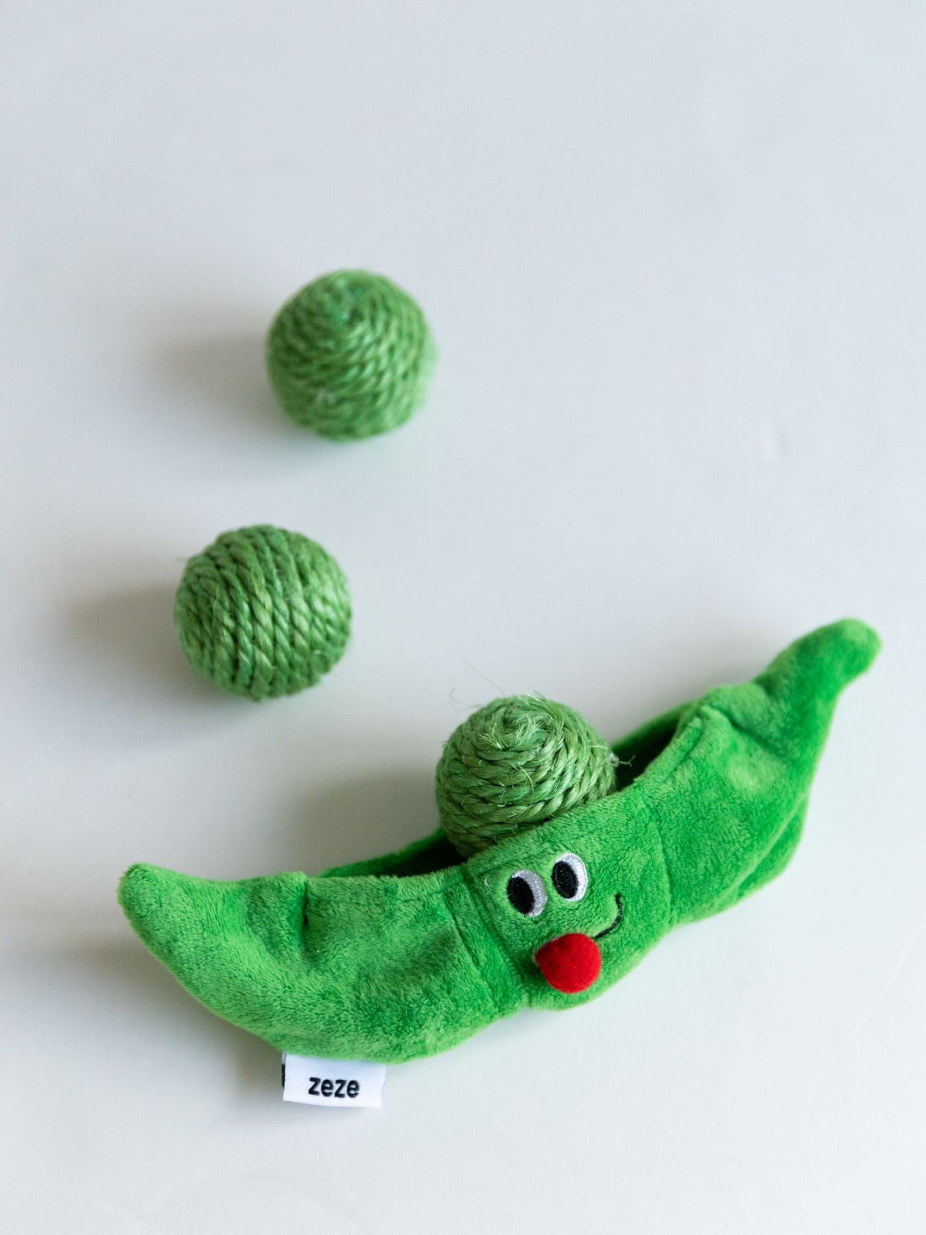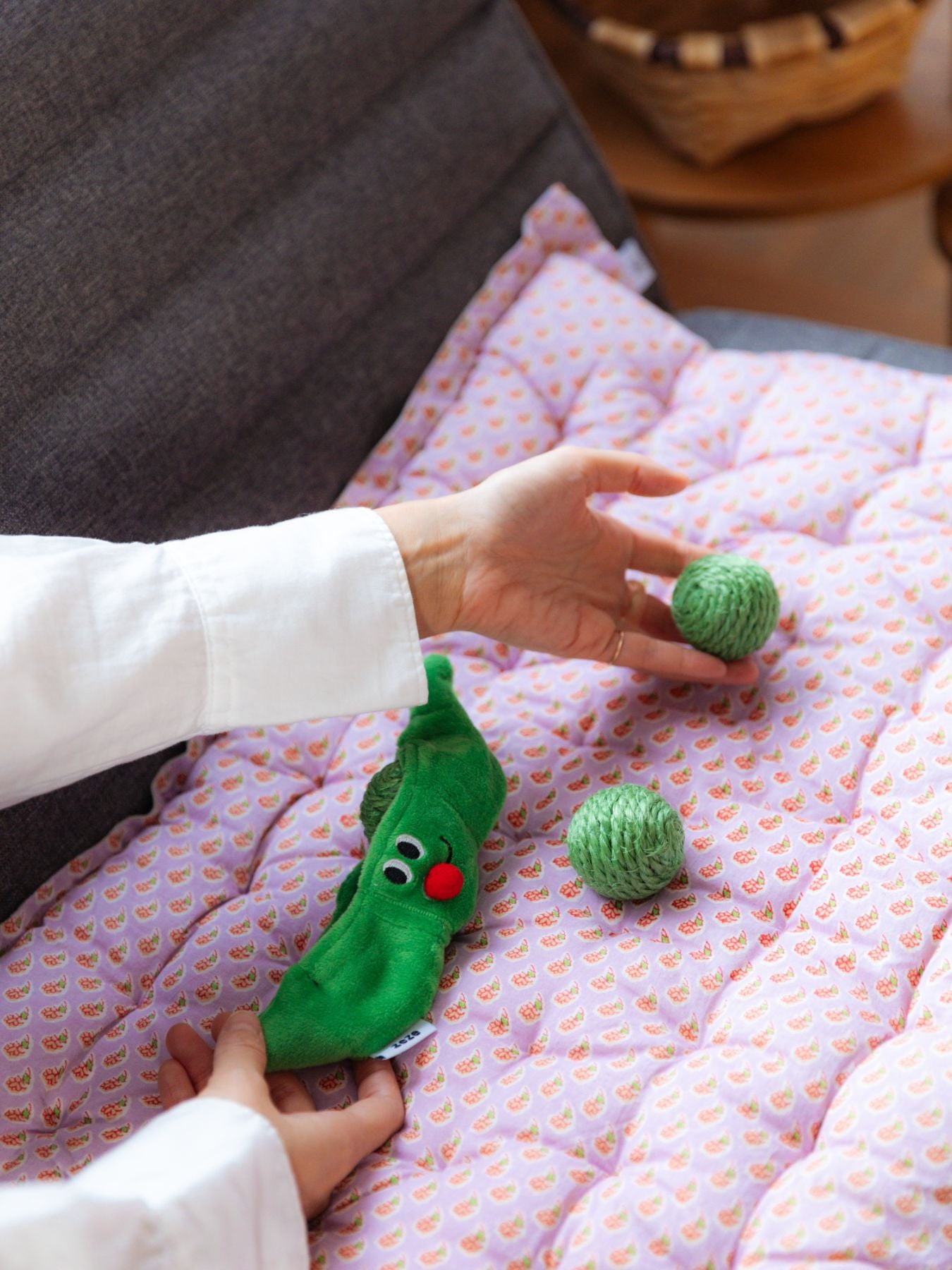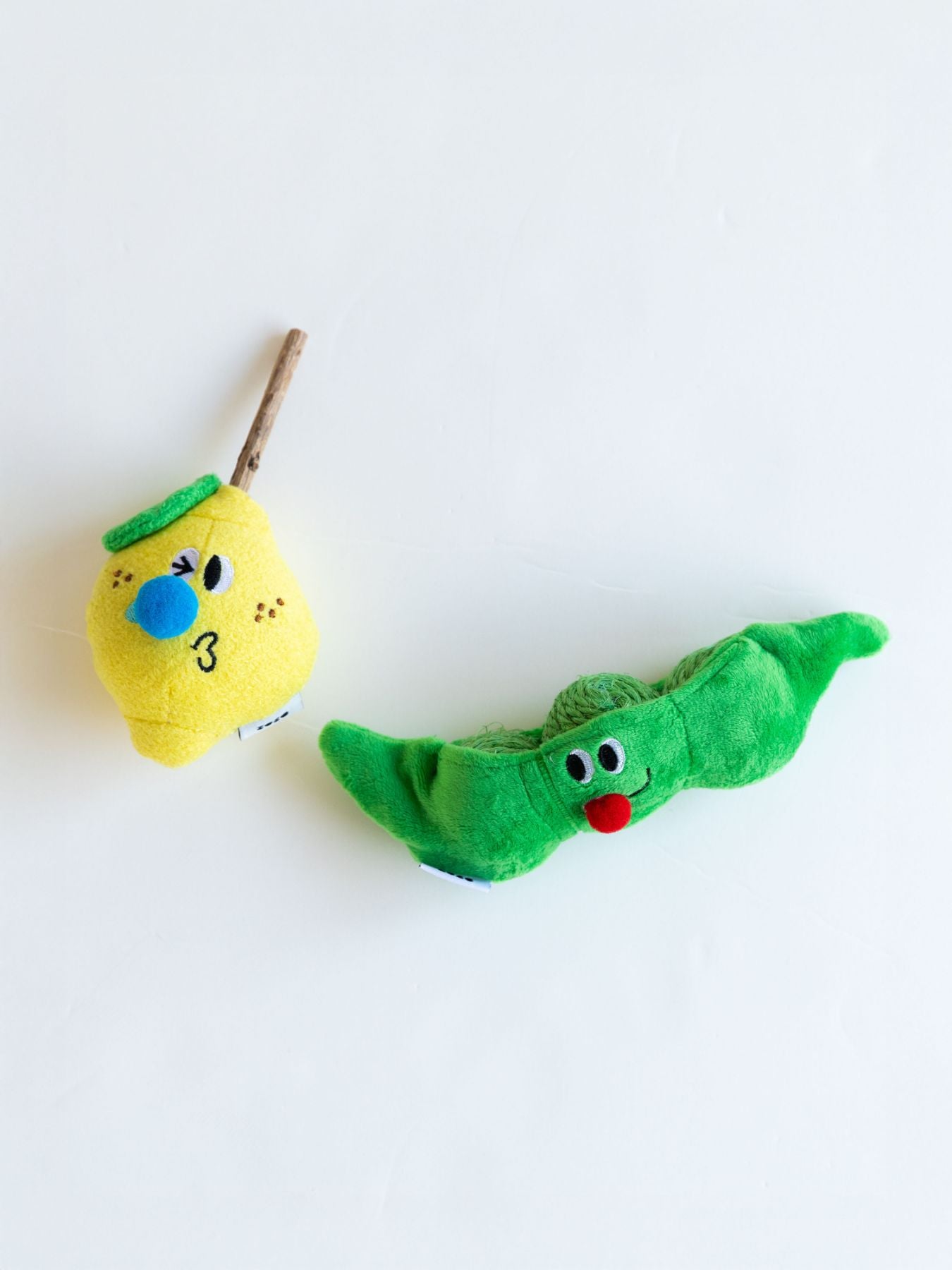 ポップなカラーと表情が可愛い、猫用おもちゃ。エンドウマメとレモンがモチーフです。